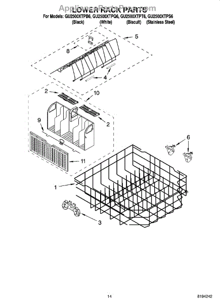 Parts for Whirlpool GU2500XTPB6: 11 - Lower Rack Parts