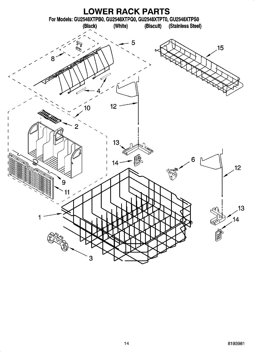 Lower dishrack assembly for dishwashers. Holds dishes, pots, and pans in the bottom section. Replace when rusted, cracked, or coating is worn or peeling.