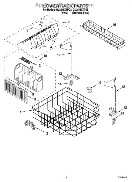 The Lower Dishwasher Rack Assembly is an OEM part for Whirlpool dishwashers. This part holds and organizes dishes, pots, and pans in the lower section of the dishwasher, ensuring they are properly positioned for effective cleaning.