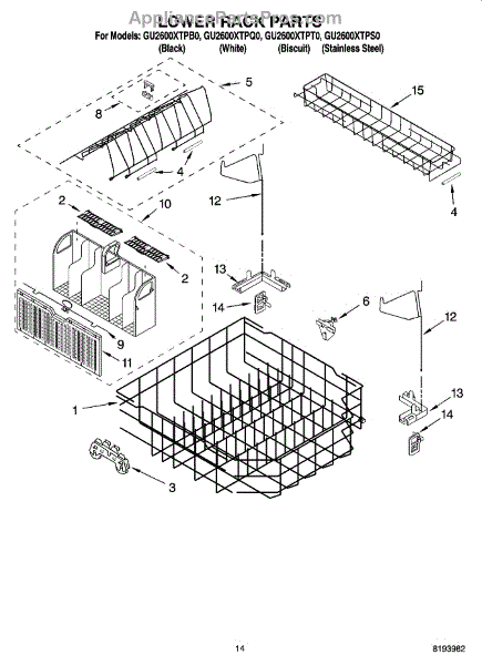 The Lower Dishwasher Rack Assembly is an OEM part for Whirlpool dishwashers. This part holds and organizes dishes, pots, and pans in the lower section of the dishwasher, ensuring they are properly positioned for effective cleaning.