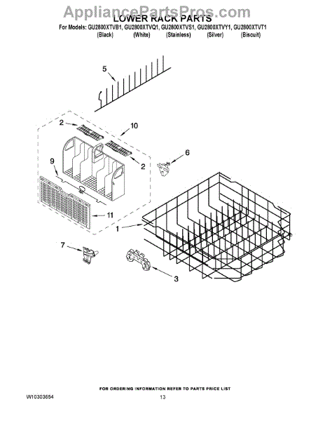 Parts for Whirlpool GU2800XTVS1: 10 - Lower Rack Parts