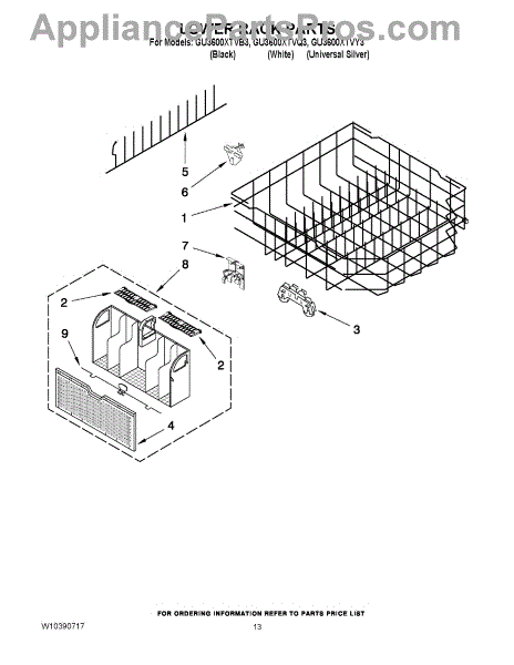 Parts for Whirlpool GU3600XTVQ3: 10 - Lower Rack Parts