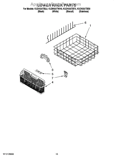 Holds utensils and cutlery in the lower rack during wash cycles. Replace if bottom is cracked, broken, has holes, or compartments are damaged or missing.