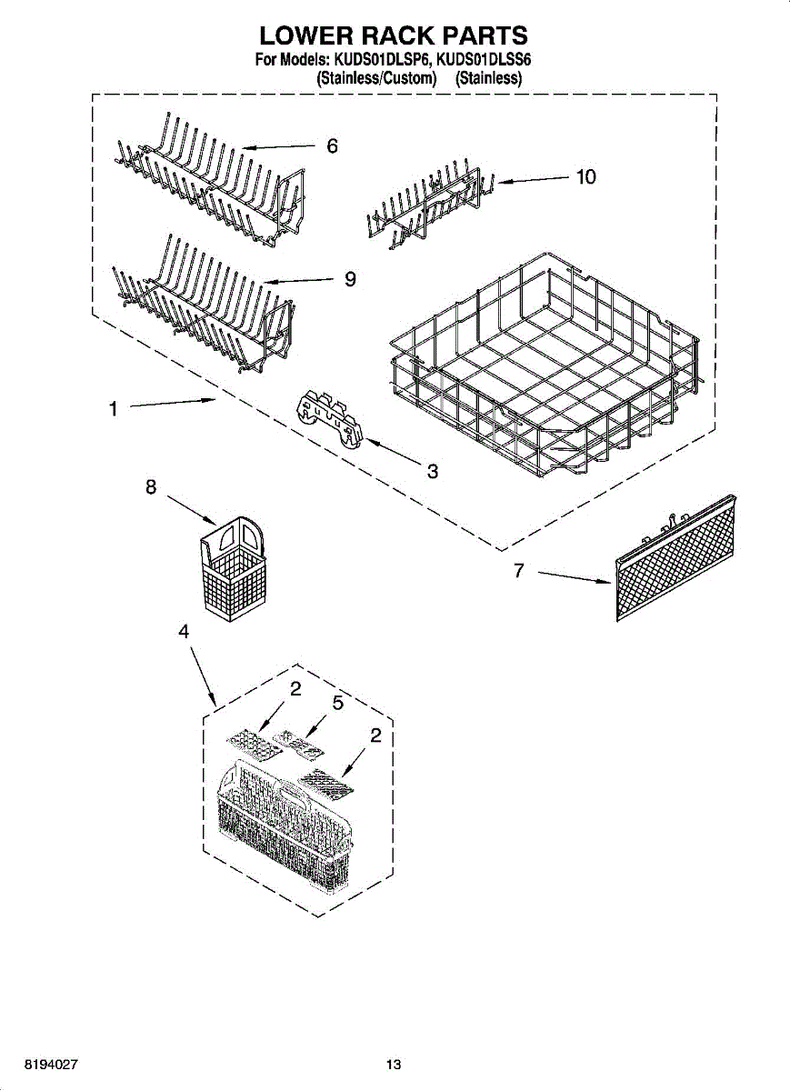 Replacement lower dishrack for dishwashers. Holds dishes, pots, and pans during wash cycles. Replace if cracked, rusted, or tines are broken or missing.
