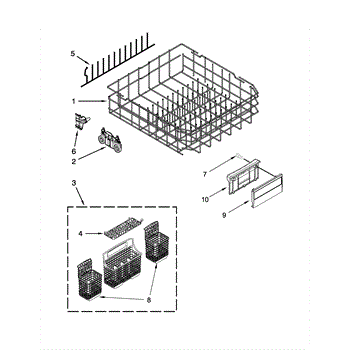 The Silverware Basket is an OEM part for Whirlpool dishwashers. It is designed to securely hold silverware and other utensils during the washing cycle, preventing them from scattering throughout the dishwasher.