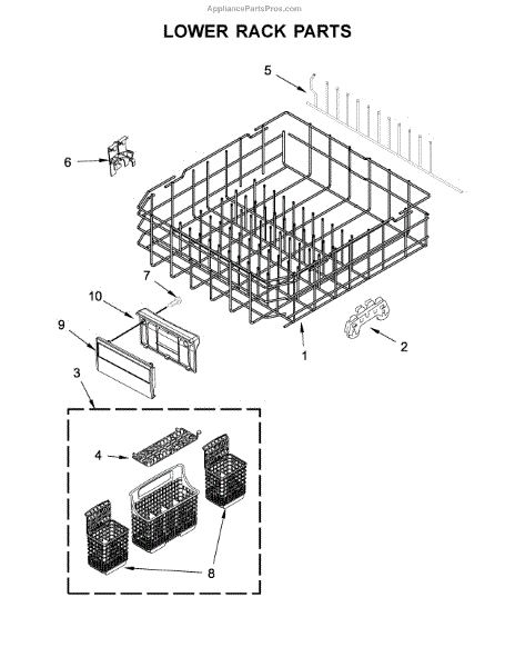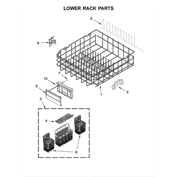 The Lower Dishrack is an OEM replacement part for Whirlpool dishwashers. It is a crucial component that holds and organizes dishes, pots, and pans during the dishwashing cycle, ensuring proper cleaning and preventing damage.