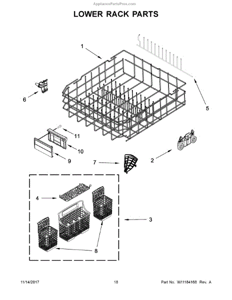 This silverware basket replaces a cracked, broken, or missing utensil holder to keep forks, knives and spoons organized during the wash cycle. It fits into the dishwasher's lower rack and helps maintain cleaning efficiency. What it does
