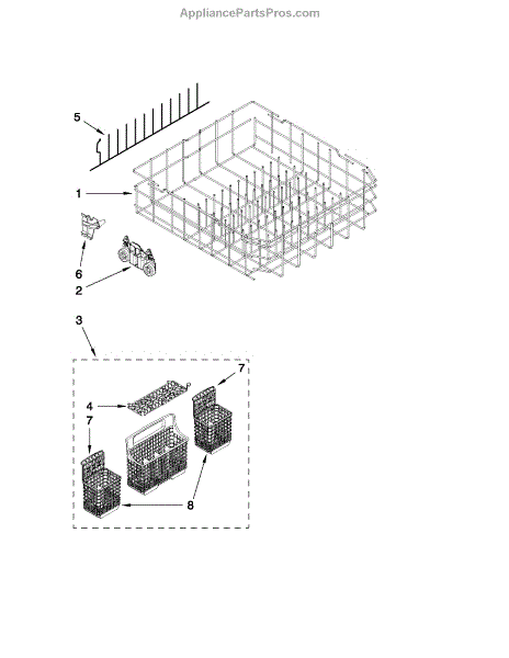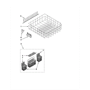 The Silverware Basket is an OEM part for Whirlpool dishwashers. It is designed to securely hold silverware and other utensils during the washing cycle, preventing them from scattering throughout the dishwasher.