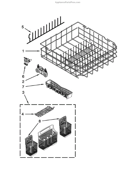 The Silverware Basket is an OEM part for Whirlpool dishwashers. It is designed to securely hold silverware and other utensils during the washing cycle, preventing them from scattering throughout the dishwasher.