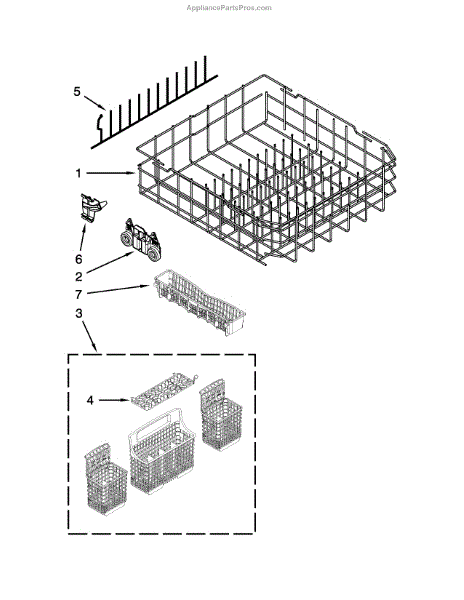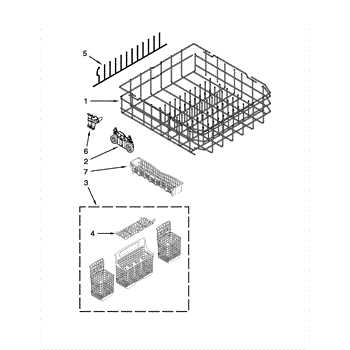 The Silverware Basket is an OEM part for Whirlpool dishwashers. It is designed to securely hold silverware and other utensils during the washing cycle, preventing them from scattering throughout the dishwasher.