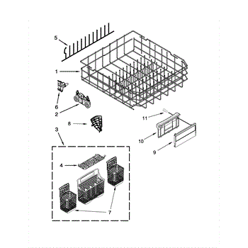 The Silverware Basket is an OEM part for Whirlpool dishwashers. It is designed to securely hold silverware and other utensils during the washing cycle, preventing them from scattering throughout the dishwasher.