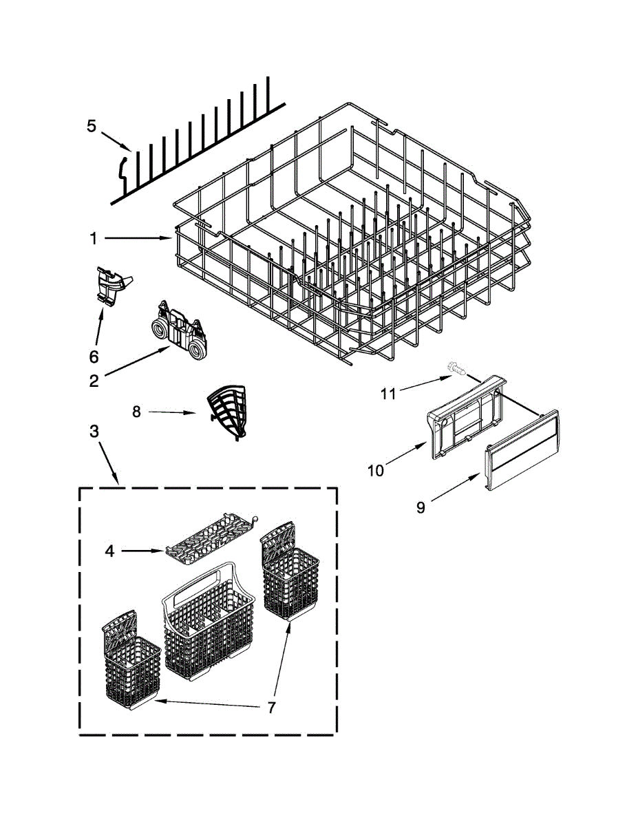 The Silverware Basket is an OEM part for Whirlpool dishwashers. It is designed to securely hold silverware and other utensils during the washing cycle, preventing them from scattering throughout the dishwasher.