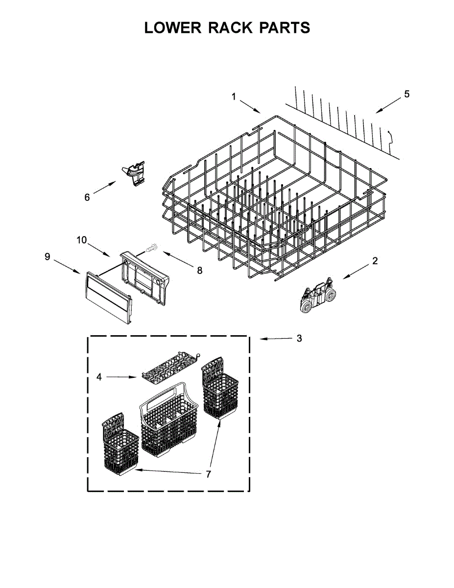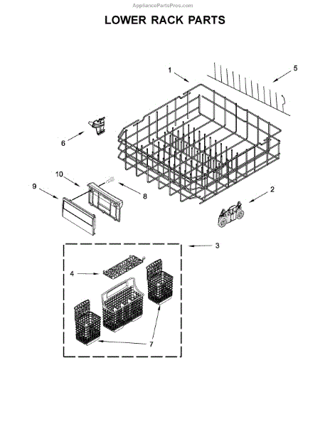 Replacement lower dishrack for dishwashers. Holds dishes, pots, and pans during wash cycles. Replace if cracked, rusted, or tines are broken or missing.