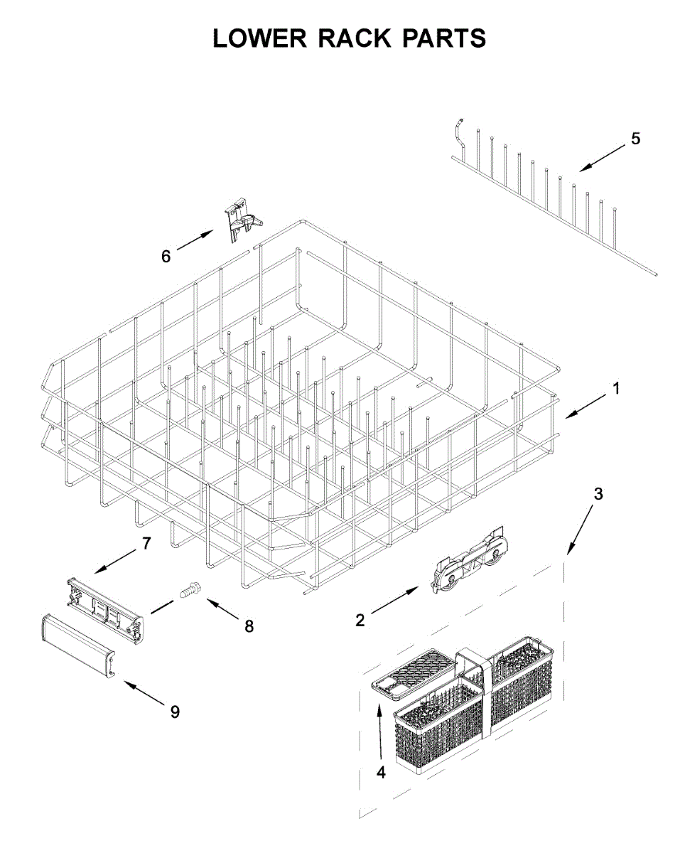 Replacement lower dishrack for dishwashers. Holds dishes, pots, and pans during wash cycles. Replace if cracked, rusted, or tines are broken or missing.
