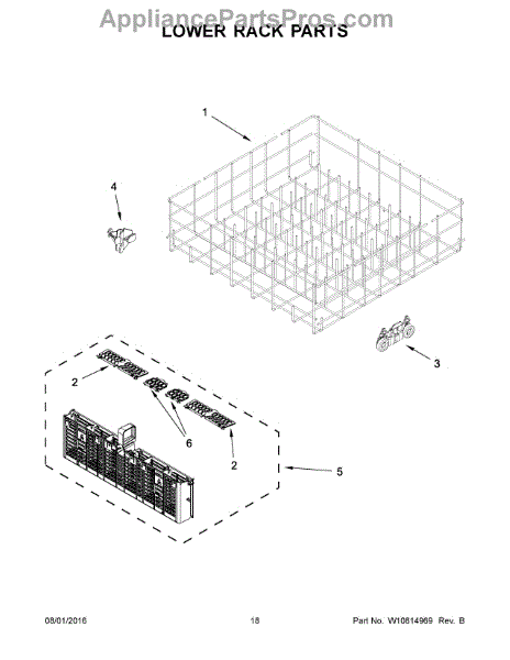 The Lower Dishwasher Rack Assembly is an OEM part for Whirlpool dishwashers. This part holds and organizes dishes, pots, and pans in the lower section of the dishwasher, ensuring they are properly positioned for effective cleaning.