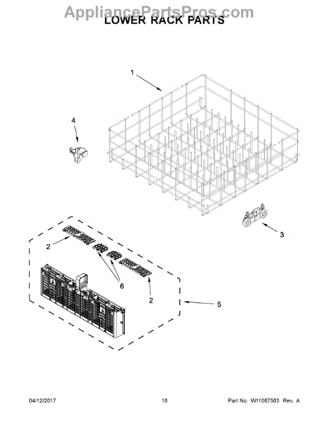 The Lower Dishwasher Rack Assembly is an OEM part for Whirlpool dishwashers. This part holds and organizes dishes, pots, and pans in the lower section of the dishwasher, ensuring they are properly positioned for effective cleaning.