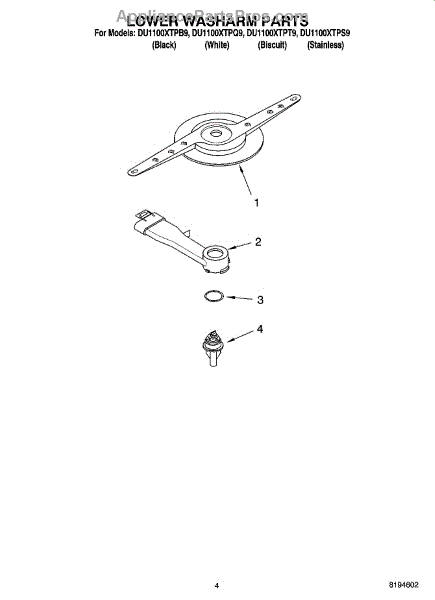 Parts for Whirlpool DU1100XTPS9: 04 - Lower Washarm Parts