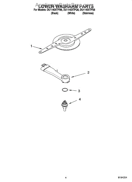 Parts for Whirlpool DU1145XTPQ6: 04 - Lower Washarm Parts