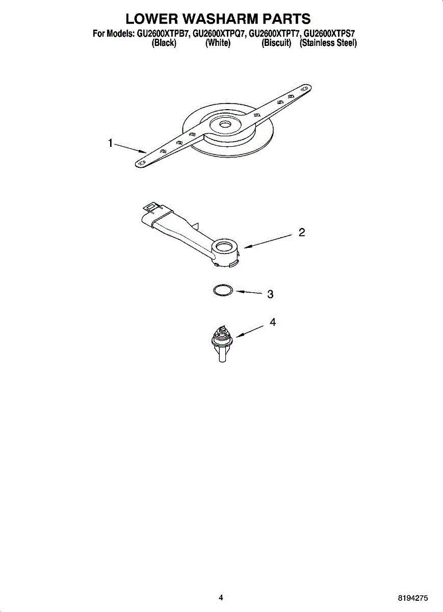 Parts for Whirlpool GU2600XTPS7: 04 - Lower Washarm Parts