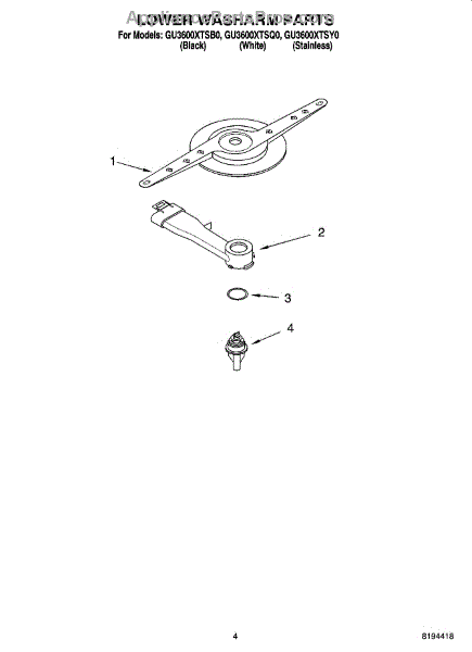 Parts for Whirlpool GU3600XTSB0: 04 - Lower Washarm Parts