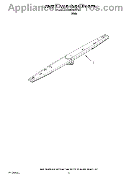 The Lower Spray Arm is an OEM part for Whirlpool dishwashers. This component is essential for distributing water throughout the dishwasher during the wash cycle. It rotates to spray water upwards, ensuring that dishes on the lower rack are thoroughly cleaned. The spray arm measures about 20 inches wide.