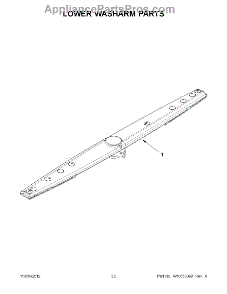 The Lower Spray Arm is an OEM part for Whirlpool dishwashers. This component is essential for distributing water throughout the dishwasher during the wash cycle. It rotates to spray water upwards, ensuring that dishes on the lower rack are thoroughly cleaned. The spray arm measures about 20 inches wide.
