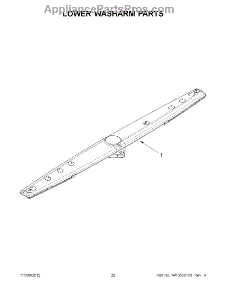 The Lower Spray Arm is an OEM part for Whirlpool dishwashers. This component is essential for distributing water throughout the dishwasher during the wash cycle. It rotates to spray water upwards, ensuring that dishes on the lower rack are thoroughly cleaned. The spray arm measures about 20 inches wide.