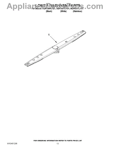 The Lower Spray Arm is an OEM part for Whirlpool dishwashers. This component is essential for distributing water throughout the dishwasher during the wash cycle. It rotates to spray water upwards, ensuring that dishes on the lower rack are thoroughly cleaned. The spray arm measures about 20 inches wide.
