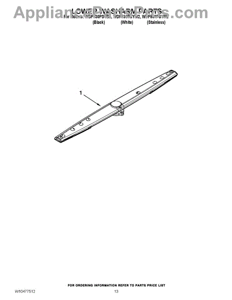 The Lower Spray Arm is an OEM part for Whirlpool dishwashers. This component is essential for distributing water throughout the dishwasher during the wash cycle. It rotates to spray water upwards, ensuring that dishes on the lower rack are thoroughly cleaned. The spray arm measures about 20 inches wide.