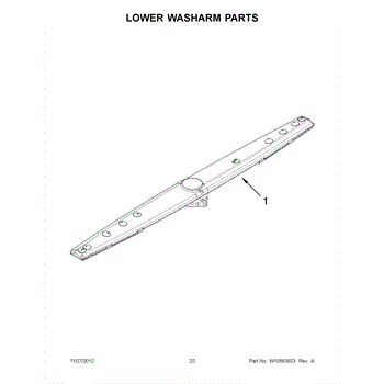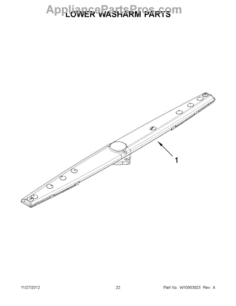 The Lower Spray Arm is an OEM part for Whirlpool dishwashers. This component is essential for distributing water throughout the dishwasher during the wash cycle. It rotates to spray water upwards, ensuring that dishes on the lower rack are thoroughly cleaned. The spray arm measures about 20 inches wide.