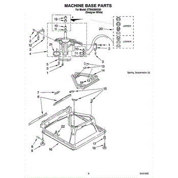 Used for direct drive washing machines. Complete assembly includes 2 level mechanism links, 1 level mechanism spring, 1 knurled pin, 2 rear feet, 1 pad plate, 1 suspension plate, 1 base pad, and 1 suspension spring retainer.