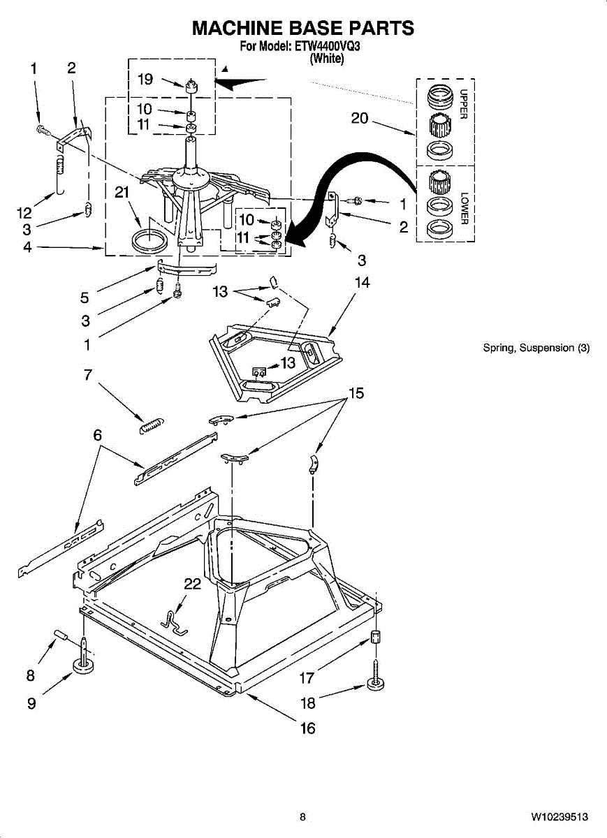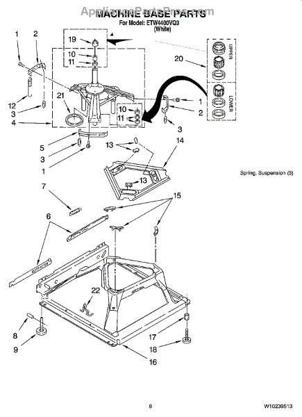Used for direct drive washing machines. Complete assembly includes 2 level mechanism links, 1 level mechanism spring, 1 knurled pin, 2 rear feet, 1 pad plate, 1 suspension plate, 1 base pad, and 1 suspension spring retainer.
