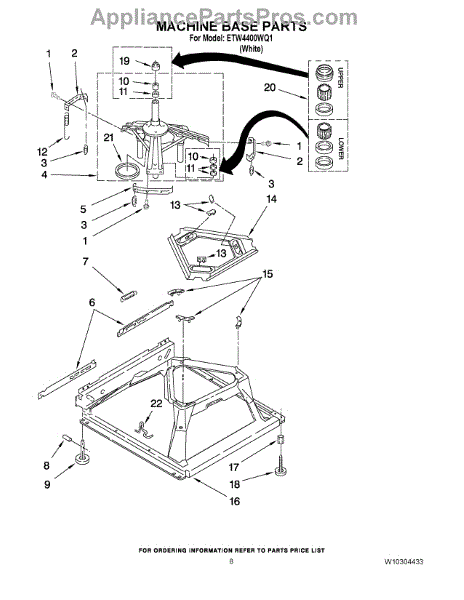 Used for direct drive washing machines. Complete assembly includes 2 level mechanism links, 1 level mechanism spring, 1 knurled pin, 2 rear feet, 1 pad plate, 1 suspension plate, 1 base pad, and 1 suspension spring retainer.