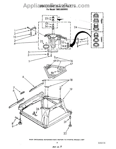 Used for direct drive washing machines. Complete assembly includes 2 level mechanism links, 1 level mechanism spring, 1 knurled pin, 2 rear feet, 1 pad plate, 1 suspension plate, 1 base pad, and 1 suspension spring retainer.