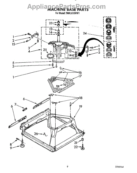 Used for direct drive washing machines. Complete assembly includes 2 level mechanism links, 1 level mechanism spring, 1 knurled pin, 2 rear feet, 1 pad plate, 1 suspension plate, 1 base pad, and 1 suspension spring retainer.