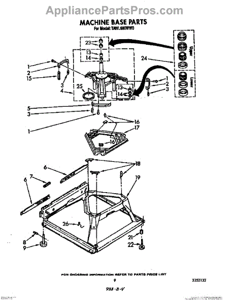 Used for direct drive washing machines. Complete assembly includes 2 level mechanism links, 1 level mechanism spring, 1 knurled pin, 2 rear feet, 1 pad plate, 1 suspension plate, 1 base pad, and 1 suspension spring retainer.