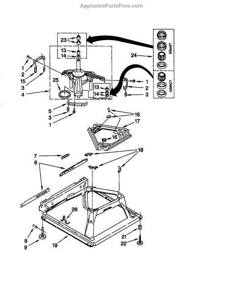 Used for direct drive washing machines. Complete assembly includes 2 level mechanism links, 1 level mechanism spring, 1 knurled pin, 2 rear feet, 1 pad plate, 1 suspension plate, 1 base pad, and 1 suspension spring retainer.
