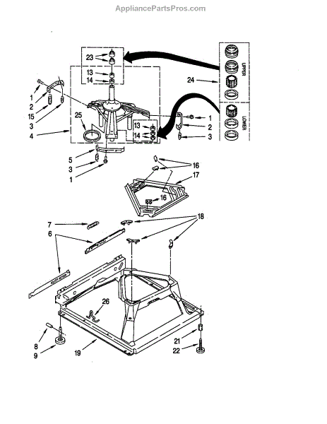 Used for direct drive washing machines. Complete assembly includes 2 level mechanism links, 1 level mechanism spring, 1 knurled pin, 2 rear feet, 1 pad plate, 1 suspension plate, 1 base pad, and 1 suspension spring retainer.