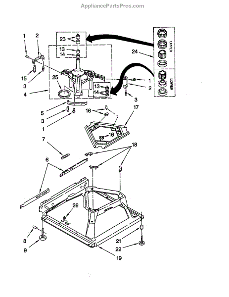 Used for direct drive washing machines. Complete assembly includes 2 level mechanism links, 1 level mechanism spring, 1 knurled pin, 2 rear feet, 1 pad plate, 1 suspension plate, 1 base pad, and 1 suspension spring retainer.