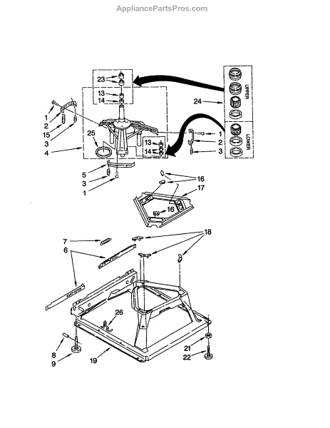 Replacement tub suspension pads for washing machines. Install under the tub to cushion and stabilize during spin cycles. Replace if cracked or missing.