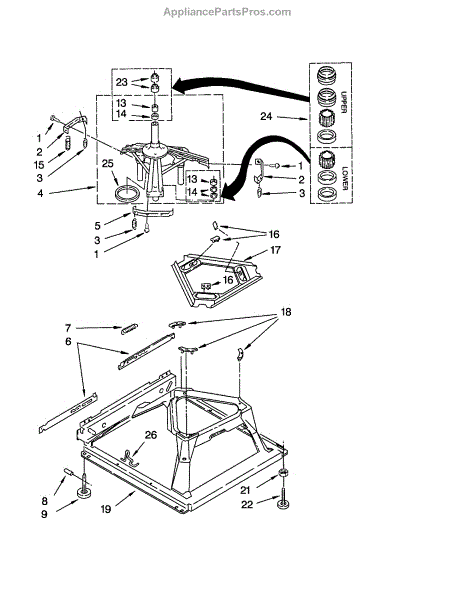 Used for direct drive washing machines. Complete assembly includes 2 level mechanism links, 1 level mechanism spring, 1 knurled pin, 2 rear feet, 1 pad plate, 1 suspension plate, 1 base pad, and 1 suspension spring retainer.