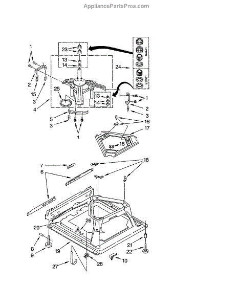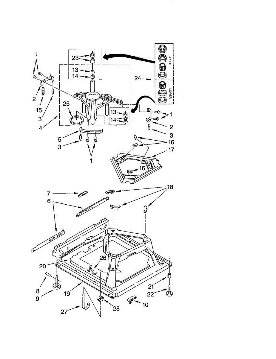 Used for direct drive washing machines. Complete assembly includes 2 level mechanism links, 1 level mechanism spring, 1 knurled pin, 2 rear feet, 1 pad plate, 1 suspension plate, 1 base pad, and 1 suspension spring retainer.
