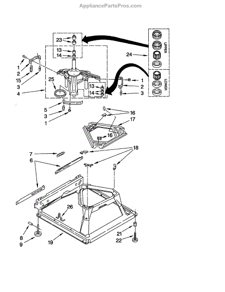 Used for direct drive washing machines. Complete assembly includes 2 level mechanism links, 1 level mechanism spring, 1 knurled pin, 2 rear feet, 1 pad plate, 1 suspension plate, 1 base pad, and 1 suspension spring retainer.