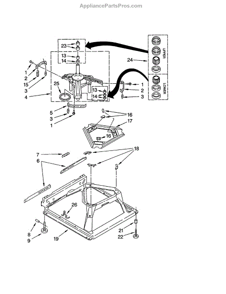 Used for direct drive washing machines. Complete assembly includes 2 level mechanism links, 1 level mechanism spring, 1 knurled pin, 2 rear feet, 1 pad plate, 1 suspension plate, 1 base pad, and 1 suspension spring retainer.
