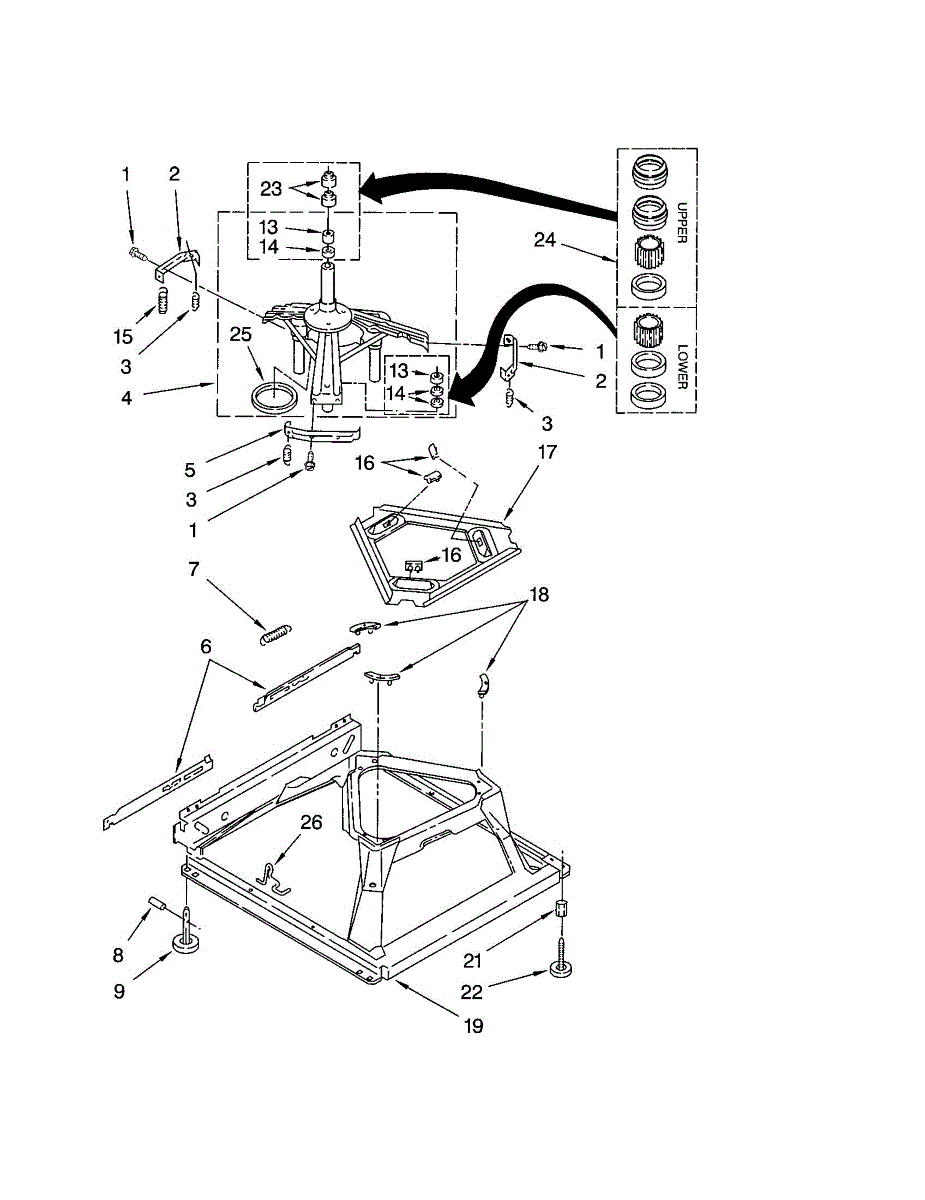 Secures suspension springs to the washer tub assembly. Replace if cracked, worn, or missing to prevent tub instability during wash and spin cycles.