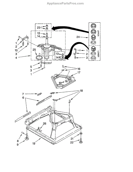 Used for direct drive washing machines. Complete assembly includes 2 level mechanism links, 1 level mechanism spring, 1 knurled pin, 2 rear feet, 1 pad plate, 1 suspension plate, 1 base pad, and 1 suspension spring retainer.