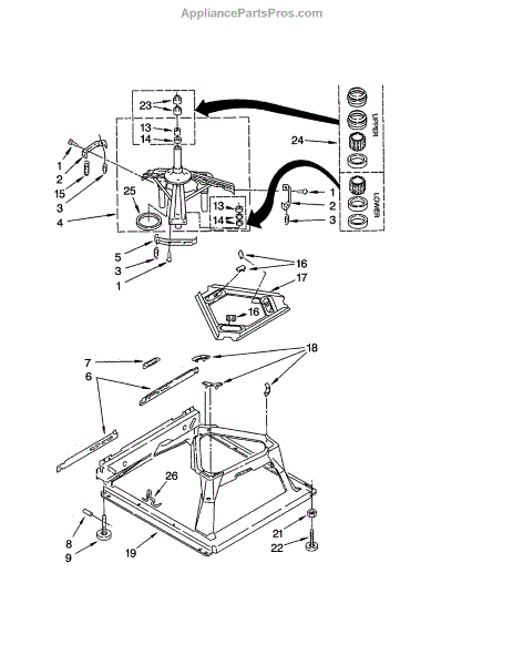 Used for direct drive washing machines. Complete assembly includes 2 level mechanism links, 1 level mechanism spring, 1 knurled pin, 2 rear feet, 1 pad plate, 1 suspension plate, 1 base pad, and 1 suspension spring retainer.