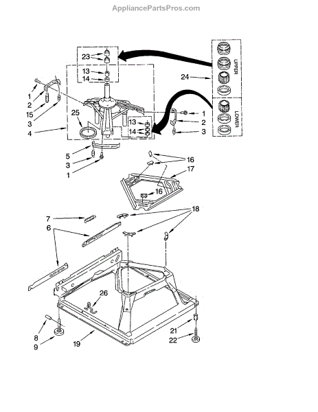 Used for direct drive washing machines. Complete assembly includes 2 level mechanism links, 1 level mechanism spring, 1 knurled pin, 2 rear feet, 1 pad plate, 1 suspension plate, 1 base pad, and 1 suspension spring retainer.