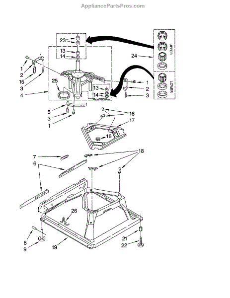 Used for direct drive washing machines. Complete assembly includes 2 level mechanism links, 1 level mechanism spring, 1 knurled pin, 2 rear feet, 1 pad plate, 1 suspension plate, 1 base pad, and 1 suspension spring retainer.