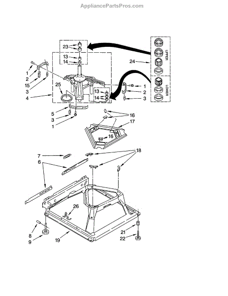 Used for direct drive washing machines. Complete assembly includes 2 level mechanism links, 1 level mechanism spring, 1 knurled pin, 2 rear feet, 1 pad plate, 1 suspension plate, 1 base pad, and 1 suspension spring retainer.
